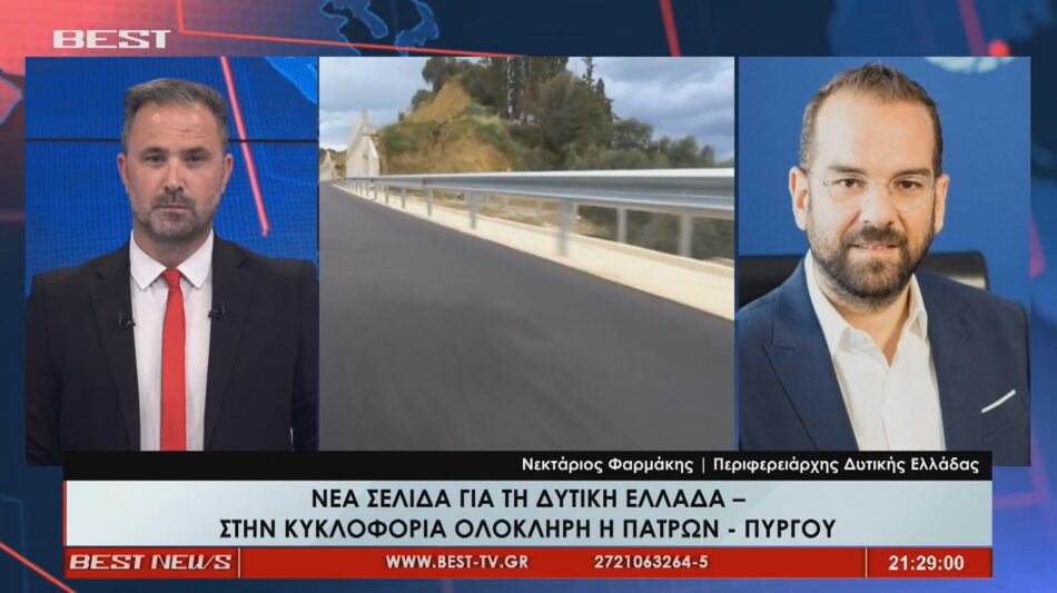 Νέα αναπτυξιακή σελίδα άνοιξε στην Περιφέρεια Δυτικής Ελλάδας με την ολοκλήρωση του αυτοκινητόδρομου Πάτρα Πύργος. Ο Περιφερειάρχης Δυτικής Ελλάδας Νεκτάριος Φαρμάκης μιλώντας στο Κεντρικό Δελτίο της τηλεόρασης BEST τονίζοντας «Οι κάτοικοι ακόμη δεν μπορούν να το πιστέψουν. Είναι πανηγυρικό συναίσθημα για κάθε πολίτη που εισέρχεται στην νέα Πατρών Πύργου και ταυτόχρονα κλείνει μια πολύ κακή μαύρη σελίδα για την περιοχή. Ανοίγει μια νέα σελίδα για τον τόπο με το σταμάτημα των χαμών ζωών αλλά και την αναπτυξιακή προοπτική που ανοίγεται μπροστά μας».