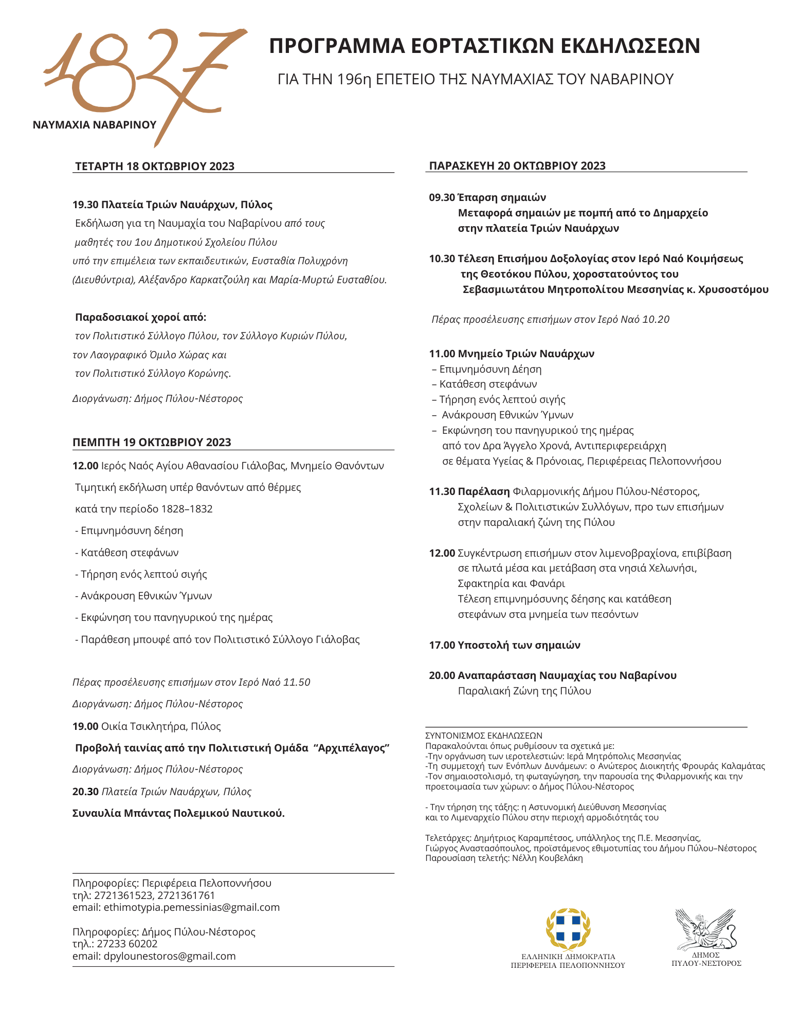 Με λαμπρότητα πραγματοποιήθηκε το απόγευμα της Τετάρτης (18/10) , η έναρξη των εορταστικών εκδηλώσεων από τον Δήμο Πύλου-Νέστορος για τον εορτασμό της 196ης επετείου της Ναυμαχίας του Ναβαρίνου.