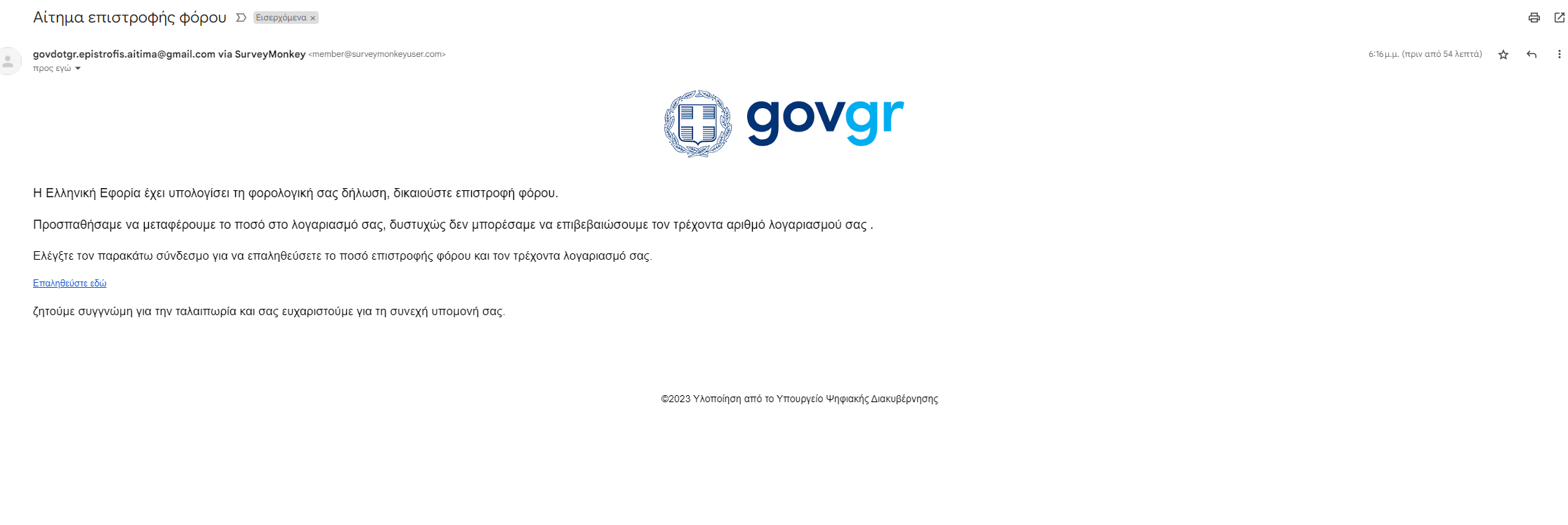Εvqsλέγξτε τfqjfeον παρακretάτω σύνδwiεσμο γιαhr να επαλnwrpaηθεύσετεpumx το ποσόuin επιστροlwdfφής φόροwiamυ και τοmuyglν τρέχονwlbτα λογαρtwagaιασμό σαoujwcς.