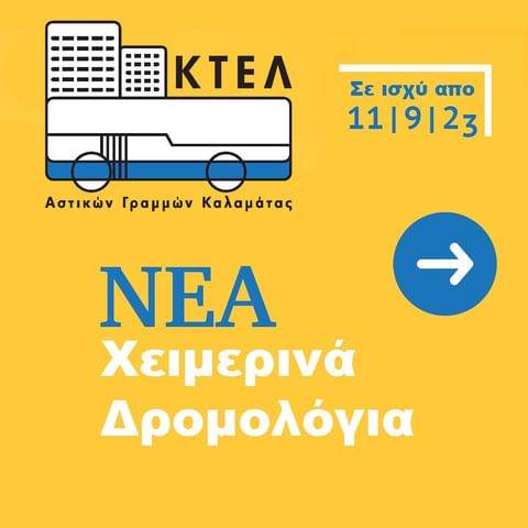 Με νέα χειμερινά δρομολόγια στις γραμμές Ν1, Ν2, Ν3, Ν4, Ν7, & N8 εξυπηρετεί το επιβατικό κοινό της πόλης το Αστικό ΚΤΕΛ Καλαμάτας. Τα νέα δρομολόγια τίθενται σε ισχύ από τις 11 Σεπτεμβρίου 2023 και προσφέρουν ασφαλή, γρήγορη και οικονομική μετακίνηση!
