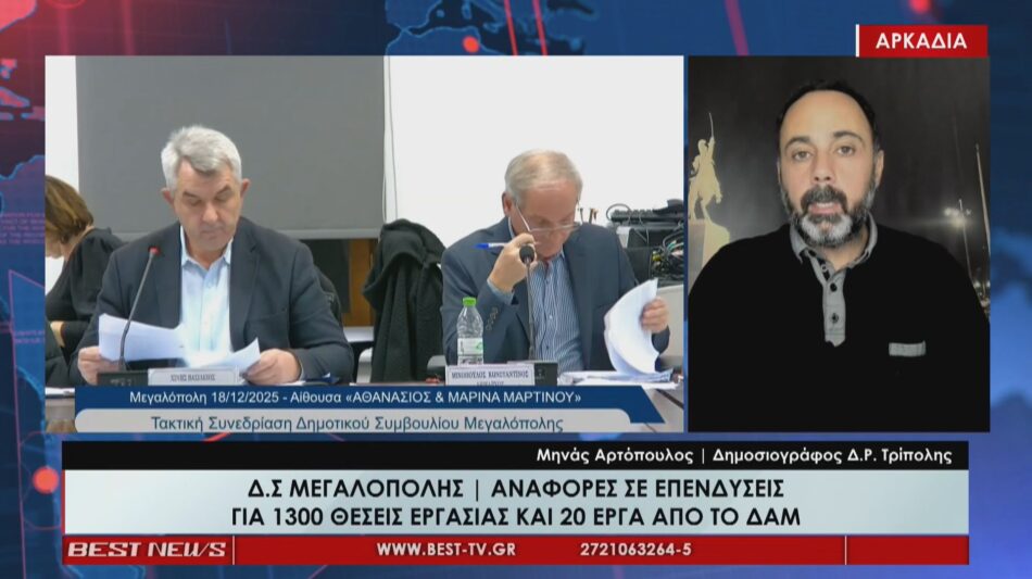 Στην ατζέντα της σημερινής επικαιρότητας, στη στήλη «Νέα της Αρκαδίας» του κεντρικού δελτίου ειδήσεων του BEST, ο δημοσιογράφος Μηνάς Αρτόπουλος σχολίασε τις αναφορές για επενδύσεις που δημιουργούν 1.300 θέσεις εργασίας και 20 έργα από το ΔΑΜ, οι οποίες συζητήθηκαν στο Δ.Σ. Μεγαλόπολης. Στα τοπικά νέα των ημερών, η Δημητσάνα «λάμπει» με τον φωτισμό των Χριστουγέννων, παρουσιάζονται οι προετοιμασίες για την παραμονή της Πρωτοχρονιάς, ενώ παράλληλα ξεκίνησε η χειμερινή σεζόν στο Μαίναλο, με το χιονοδρομικό κέντρο να ανοίγει τις πύλες του.