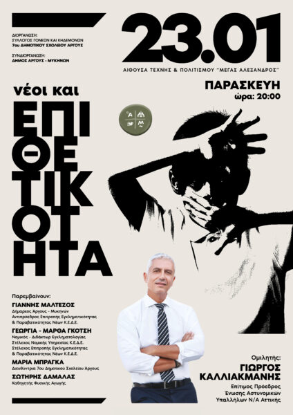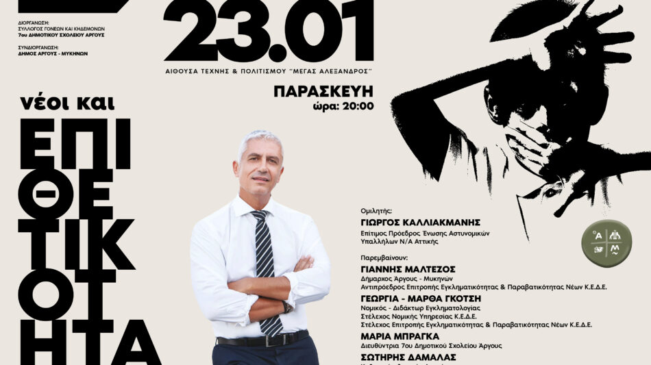 Μια πολύ ενδιαφέρουσα ημερίδα ενημέρωσης γονέων, εκπαιδευτικών και μαθητών θα πραγματοποιηθεί την Παρασκευή 23 Ιανουαρίου 2026 και ώρα 20:00 στην Αίθουσα Τέχνης & Πολιτισμού «Μέγας Αλέξανδρος» στο Άργος, την οποία διοργανώνει ο Σύλλογος Γονέων και Κηδεμόνων του 7ου Δημοτικού Σχολείου Άργους, σε συνδιοργάνωση με τον Δήμο Άργους – Μυκηνών.