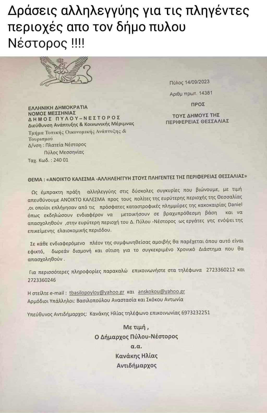 Ο Ηλίας Κανάκης είναι Αντιδήμαρχος Πύλου-Νέστορος και υπέγραψε επίσημο χαρτί του δήμου(!!!) απευθυνόμενος στους δήμους της Θεσσαλίας καλώντας τους πληγέντες που ακόμη δεν έχουν θάψει τους δικούς τους ανθρώπους να πάνε για εργάτες γης!!! για λίγο στην περιοχή μας μιλώντας και για αμοιβές και άλλα τέτοια τινά. Μάλιστα έφθασε στο σημείο αυτό να το αναρτήσει και να το βαπτίσει «δράσεις αλληλεγγύης για τους πληγέντες».