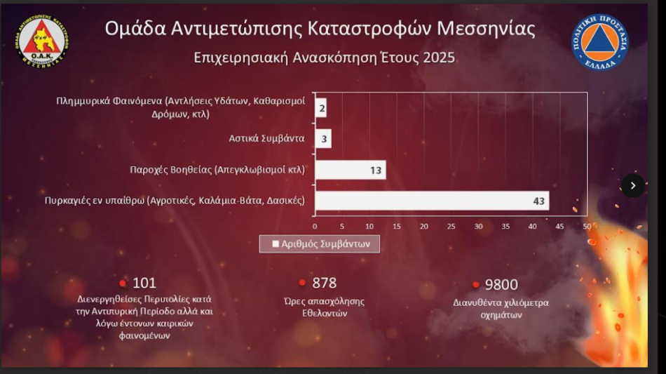 Η ομάδα αντιμετώπισης καταστροφών (Ο.Α.Κ.) της Μεσσηνίας κάνει έναν απολογισμό για το έτος που μας πέρασε σχετικά με τις δράσεις της, οι οποίες ήταν επιχειρήσεις σε πυρκαγιές, παροχές βοήθειας σε πολίτες, αστικά συμβάντα και επεμβάσεις σε πλημμυρικά φαινόμενα.