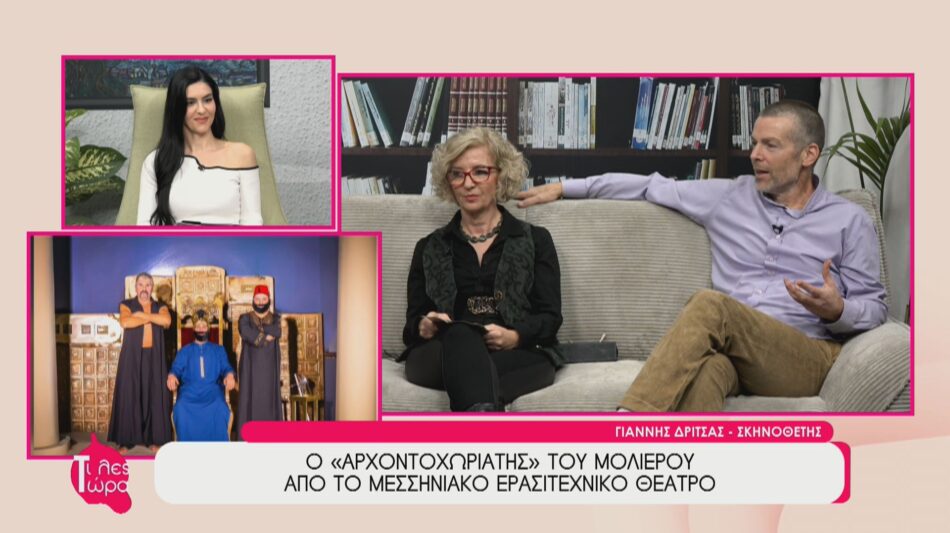 Ο σκηνοθέτης/ηθοποιός Γιάννης Δρίτσας και η ερασιτέχνης ηθοποιός Τζένη Λαμπροπούλου ήταν καλεσμένοι της Αναστασίας Μάντζαρη στην εκπομπή «Τι Λες Τώρα» και μίλησαν για το ανέβασμα του έργου «Ο Αρχοντοχωριάτης» του Μολιέρου από το Μεσσηνιακό Ερασιτεχνικό Θέατρο. Οι συντελεστές εξήγησαν πώς η παράσταση, που ξεκίνησε για παιδιά, εξελίχθηκε σε ένα εξαιρετικό θέαμα για όλες τις ηλικίες και αναφέρθηκαν στη μεγάλη θερμή ανταπόκριση του κοινού. Μη χάσετε τις τελευταίες παραστάσεις που ανεβαίνουν στο Εργατικό Κέντρο Καλαμάτας το Σάββατο 13 και την Κυριακή 14 Δεκεμβρίου.
