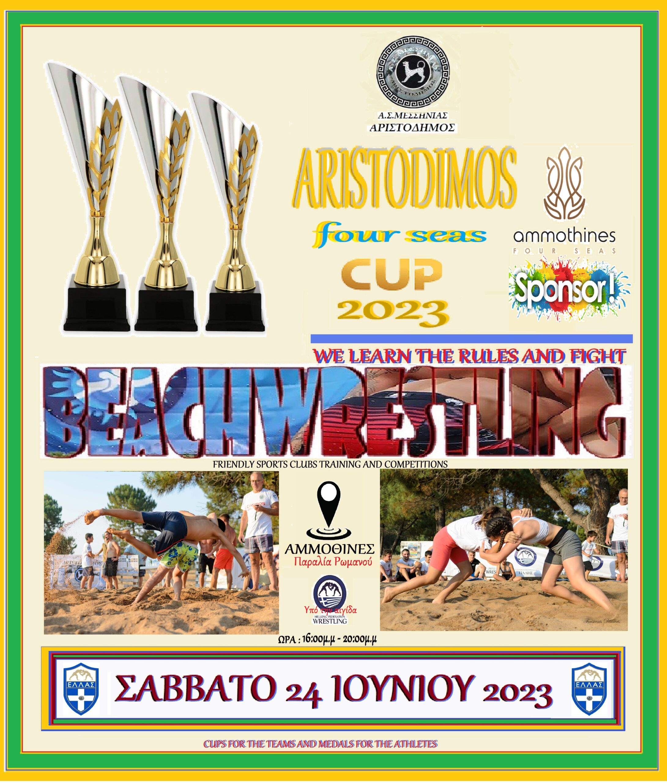 Στις 24 Ιουνίου ο ΑΡΙΣΤΟΔΗΜΟΣ μαζί με τους Παλαιστικούς Συλλόγους Σπάρτης,  Πύργου ΤΙΤΑΝ, ΑΤΛΑ ΣΑΛΑΜΙΝΑΣ και ΛΕΩΝΙΔΑ ΣΠΑΡΤΗΣ,  υποδέχονται το καλοκαίρι παλεύοντας στην παραλία , σε ένα μεσογειακό περιβάλλον στα νερά του Ιονίου, δίπλα από το Costa Navarino, σε μια διοργάνωση που τελεί υπό την αιγίδα της Ελληνικής Ομοσπονδίας Πάλης.