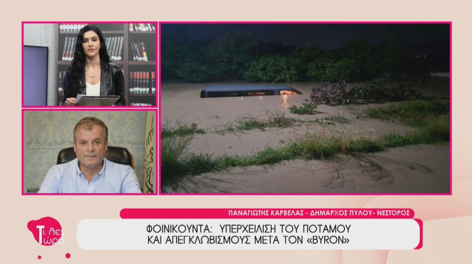 Ο Δήμαρχος Πύλου-Νέστορος, Παναγιώτης Καρβέλας, μίλησε στην εκπομπή «Τι Λες Τώρα» με την Αναστασία Μάντζαρη και μετέφερε την ακριβή εικόνα των καταστροφών που άφησε πίσω του η κακοκαιρία «Byron» στη Φοινικούντα και τις γύρω περιοχές. Ο κ. Καρβέλας περιέγραψε τη δύσκολη νύχτα της υπερχείλισης του ποταμού, όπου κινδύνευσαν άνθρωποι και χρειάστηκαν απεγκλωβισμοί. Μετά τον ανεμοστρόβιλο της προηγούμενης εβδομάδας, η περιοχή βρίσκεται αντιμέτωπη με διπλή κρίση.