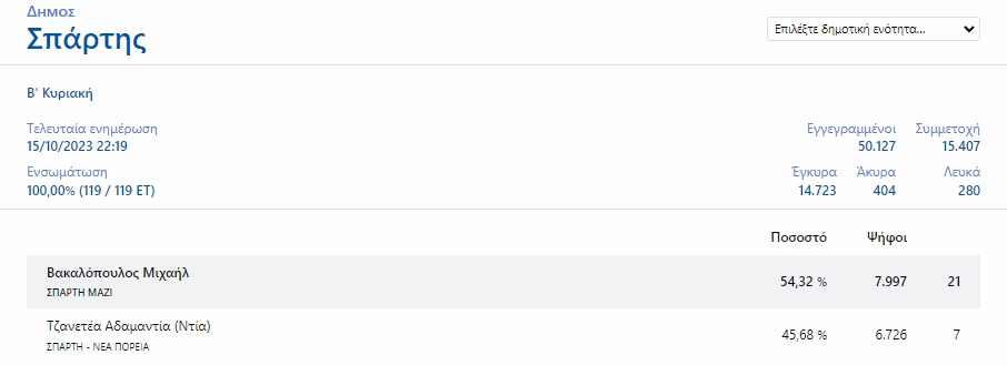 Την απόλυτη ανατροπή έφεραν οι αυτοδιοκητικές εκλογές του Οκτωβρίου στην Σπάρτη, εκεί όπου ο απερχόμενος πια δήμαρχος Πέτρος Δούκας (έλαβε μόλις 5,42%) θα παραδώσει τη σκυτάλη στο νέο δήμαρχο Μιχάλη Βακαλόπουλο. Ο νέος δήμαρχος που θα αναλάβει τα ηνία τον Ιανουαρίου 2024, έλαβε στον δεύτερο γύρο των εκλογών ποσοστό 54,32% και στο νέο δημοτικό συμβούλιο θα έχει 21 έδρες. Με και ποσοστό 45,68% στον δεύτερο γύρο της εκλογικής διαδικασίας η Ντία Τζανετέα έλαβε 6.726 ψήφους και εξασφαλίζει 7 έδρες στο νέο δημοτικό συμβούλιο.