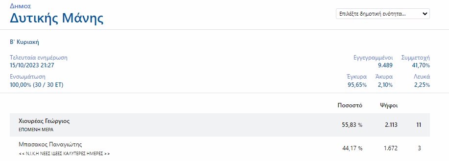 Με ποσοστό 55,83% ο Γιώργος Χιουρέας κέρδισε την μάχη του σταυρού στη Δυτική Μάνη και παραλαμβάνει τα ηνία του δήμου.«Ο κόσμος μας αγκάλιασε από την πρώτη στιγμή. Θέλω να ευχαριστήσω όλους για τον τίμιο αγώνα που έκαναν, κι εσάς που μας δώσατε βήμα αρκετές φορές. Ο κόσμος αποφάσισε ότι ήρθε η ώρα της αλλαγής. Μέχρι τώρα είχαμε ένα άλλο μοντέλο στη δημαρχία. Ο κόσμος έδειξε ότι κουράστηκε και θέλει να πάμε παρακάτω. Έχουμε όραμα, όρεξη και γνώσεις να πάμε το δήμο μας ένα βήμα παραπέρα» δήλωσε στην τηλεόραση BEST ο Γιώργος Χιουρέας αμέσως μετά την τελική καταμέτρηση των ψήφων στα 30 εκλογικά τμήματα του δήμου. Στο 100% της ενσωμάτωσης και με ποσοστό συμμετοχής ήταν 41,70%, ο συνδυασμός του κου Χιουρέα έλαβε 2.113 ψήφους φτάνοντας στο 55,83%. Στο νέο Δημοτικό Συμβούλιο θα έχει 11 έδρες και ο Παναγιώτης Μπασακος που έλαβε 44,17 % και 1.672 ψήφους θα έχει 3 έδρες.