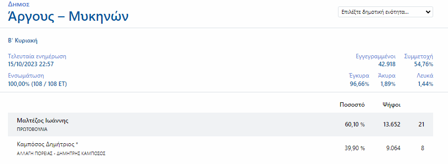 Η εκλογική αναμέτρηση του β΄ γύρου στις αυτοδιοικητικές εκλογές στον δήμο Άργους Μυκηνών ανέδειξε νικητή τον Γιάννη Μαλτέζο, ο οποίος μετά το τέλος της καταμέτρησης των ψηφοδελτίων στα 107 από τα 108 συνολικά εκλογικά τμήματα έλαβε σαφή εντολή με ποσοστό που ξεπερνά το 60,10% της λαϊκής βούλησης. Ο νέος δήμαρχος και η παράταξή του “Πρωτοβουλία” εξασφαλίζει 21 έδρες στο νέο δημοτικό συμβούλιο του δήμου, εκεί όπου ο συνδυασμός του απερχόμενου δημάρχου, Δημήτρη Καμπόσου που έλαβε ποσοστό 39,90% θα έχει 8 έδρες με την καταμέτρηση των ψηφοδελτίων να έχει ολοκληρωθεί.