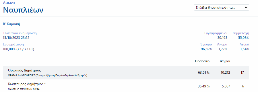 Με ποσοστό που ξεπερνά το 60% ο Δημήτρης Ορφανός παραλαμβάνει τη σκυτάλη του δήμου Ναυπλιέων. Στον δεύτερο γύρο των αυτοδιοικητικών εκλογών ο συνδυασμός του, «Όραμα Δημιουργίας (Συνεργαζόμενη Παράταξη Ανάπλι Εμπρός)» έλαβε 63,51%, με την ενσωμάτωση στο 100%, έναντι του 36,49% που συγκέντρωσε ο απερχόμενος δήμαρχος, Δημήτριος Κωστουρος. Στο νέο δημοτικό συμβούλιο ο συνδυασμός του νέου δημάρχου θα έχει 17 έδρες και 6 ο συνδυασμός «Ναύπλιο. Επόμενη μέρα».