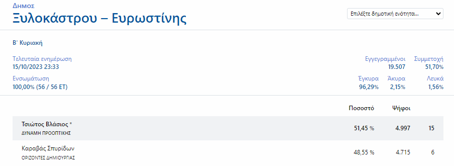 Στον δεύτερο γύρο των αυτοδιοικητικών εκλογών στην Κορινθία και στον δήμο Ξυλοκάστρου – Ευρωστίνης ο Βλάσιος Τσιώτος με ποσοστό άνω του 50% κέρδισε τη μάχη και επανεκλέγεται δήμαρχος. Ο επανεκλεγείς δήμαρχος και η παράταξή του, “Δύναμη Προοπτικής” εξασφαλίζει 15 έδρες στο νέο δημοτικό συμβούλιο, ενώ 6 θα έχει ο συνδυασμός του Σπύρου Καραβά.
