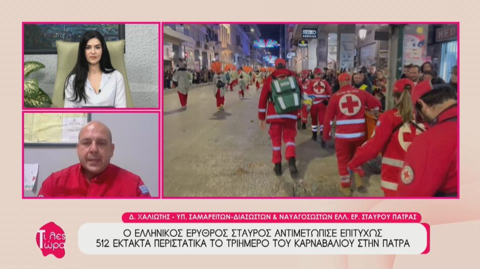 Με απόλυτη επιτυχία ολοκληρώθηκε το φετινό Πατρινό Καρναβάλι, έχοντας ως «ασπίδα προστασίας» τους εθελοντές του Ελληνικού Ερυθρού Σταυρού. Καλεσμένος στην εκπομπή «Τι λες τώρα» με την Αναστασία Μάντζαρη, ο υπεύθυνος του Σώματος Εθελοντών Σαμαρειτών, Διασωστών και Ναυαγοσωστών Ελληνικού Ερυθρού Σταυρού Πάτρας , κ. Δημήτρης Χαλιώτης, προχώρησε στον απολογισμό των 512 περιστατικών που αντιμετωπίστηκαν με επαγγελματισμό στην κινητή μονάδα υγείας και στις  5 πλήρως εξοπλισμένες σκηνές στην Πλατεία Γεωργίου.