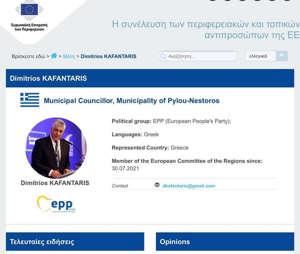 Με απόφαση του υπουργού Εσωτερικών Μάκη Βορίδη, ο Γενικός Γραμματέας της ΚΕΔΕ Δημήτρης Καφαντάρης, πρώβην δήμαρχος Πύλου-Νέστορος, ορίστηκε ως μέλος της Ελληνικής Αντιπροσωπείας στην Ευρωπαϊκή Επιτροπή των Περιφερειών.