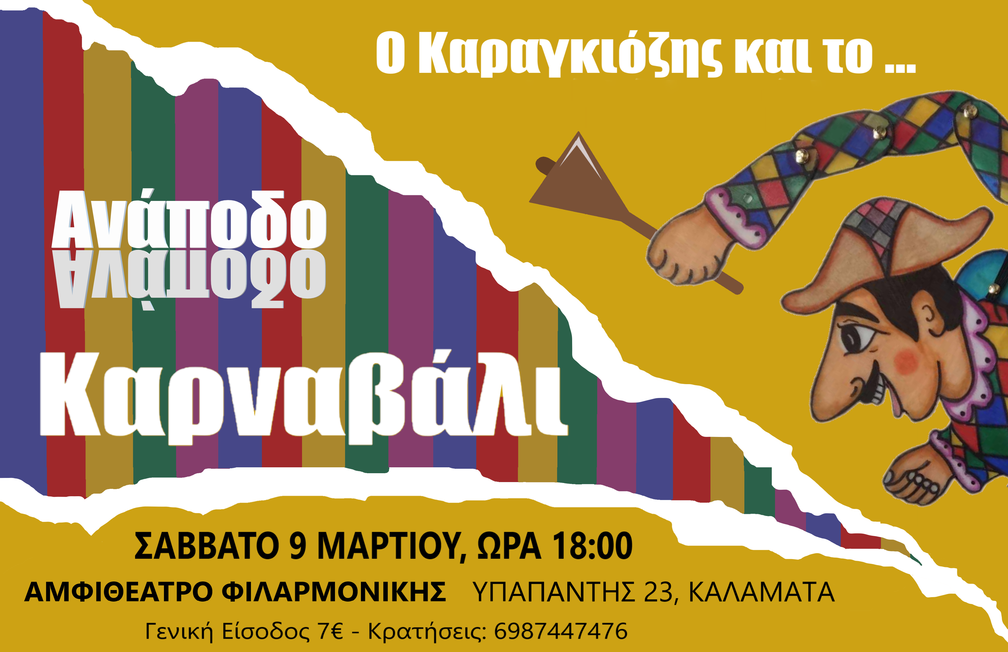 Μια ολοκαίνουρια και πρωτότυπη αποκριάτικη παράσταση σκιών από τον Κωνσταντίνο Δημητρακόπουλο και την Γεωργία Δημητρακοπούλου, για μια μοναδική παρουσίαση στο κοινό το Σάββατο 9 Μαρτίου και ώρα 18:00 το απόγευμα στο Αμφιθέατρο Φιλαρμονικής Καλαμάτας!