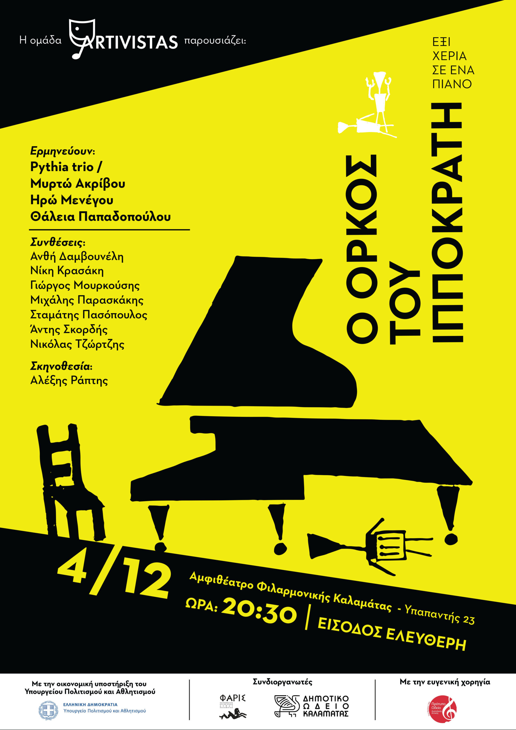 Το πολιτιστικό “Φθινοπωρινό ταξίδι” συνεχίζεται στη Μεσσηνία που καλωσορίζει τον χειμώνα με μια ακόμη ξεχωριστική εκδήλωση. Το Σάββατο 4 Δεκεμβρίου 2021, στις 20:30, στο Αμφιθέατρο Φιλαρμονικής Καλαμάτας θα εμφανιστούν τρεις πιανίστες σ’ ένα πιάνο που ερμηνεύουν εφτά νέες συνθέσεις σε μια πρωτότυπη συναυλία – παράσταση, εμπνευσμένη από το έργο του Mauricio Kagel (1931 – 2008) “Ο Όρκος του Ιπποκράτη” (1984), γραμμένο επίσης για το ίδιο σύνολο.