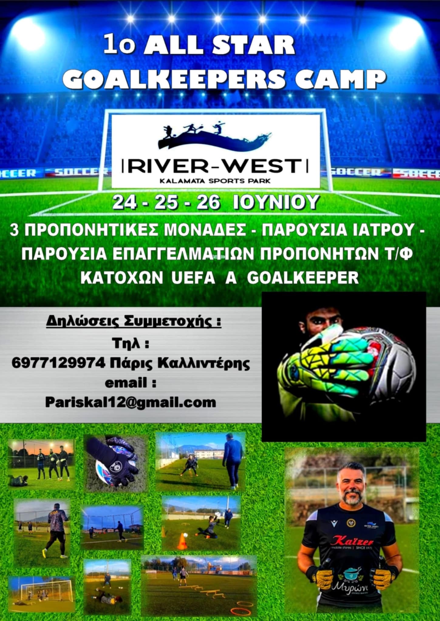 Παράλληλα διοργανώνει στις 24 με 26 Ιουνίου το 1ο All Star Goalkeepers Camp. Ένα τριήμερο δράσης για τερματοφύλακες ηλικίας από 9 ετών και άνω, το οποίο διοργανώνει ο κάτοχος διπλώματος UEFA National Goalkeeper. Η δράση θα πραγματοποιηθεί στον χώρο όπου δραστηριοποιείται, το River West Sport Park, στην Καλαμάτα και αναμένεται να συμμετέχουν επαγγελματίες προπονητές τερματοφυλάκων με δίπλωμα UEFA A Goalkeeper, καθώς και εξειδικευμένοι επιστήμονες που θα πραγματοποιήσουν ενημερωτικά σεμινάρια.