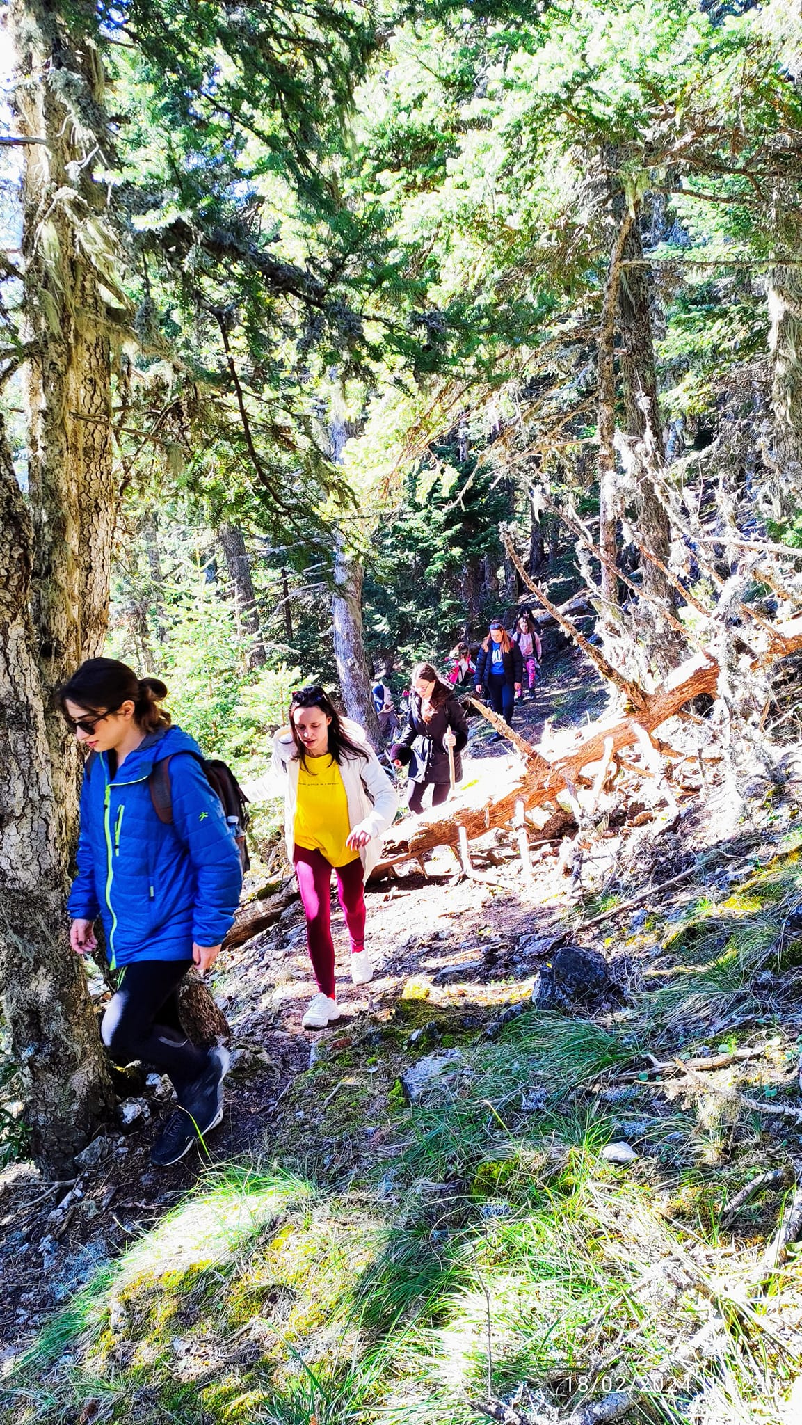 Κατόπιν οι πενήντα δύο πεζοπόροι με κατεύθυνση προς τα αριστερά, παρέκαμψαν το μονοπάτι που οδηγεί στην κορυφή Οστρακίνα (1.981 μ.) και πήραν το μονοπάτι κατηφορίζοντας μέσα στο πυκνό δάσος ελάτων, που οδηγεί στο Λεβίδι.