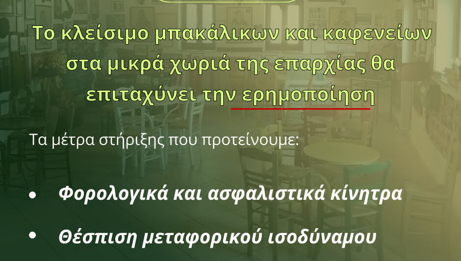 Οδ. Κωνσταντινόπουλος: Η επιβίωση των καφενείων και παντοπωλείων των χωριών και η θέσπιση μεταφορικού ισοδύναμου ως τελευταίο ανάχωμα απέναντι στην ερημοποίηση