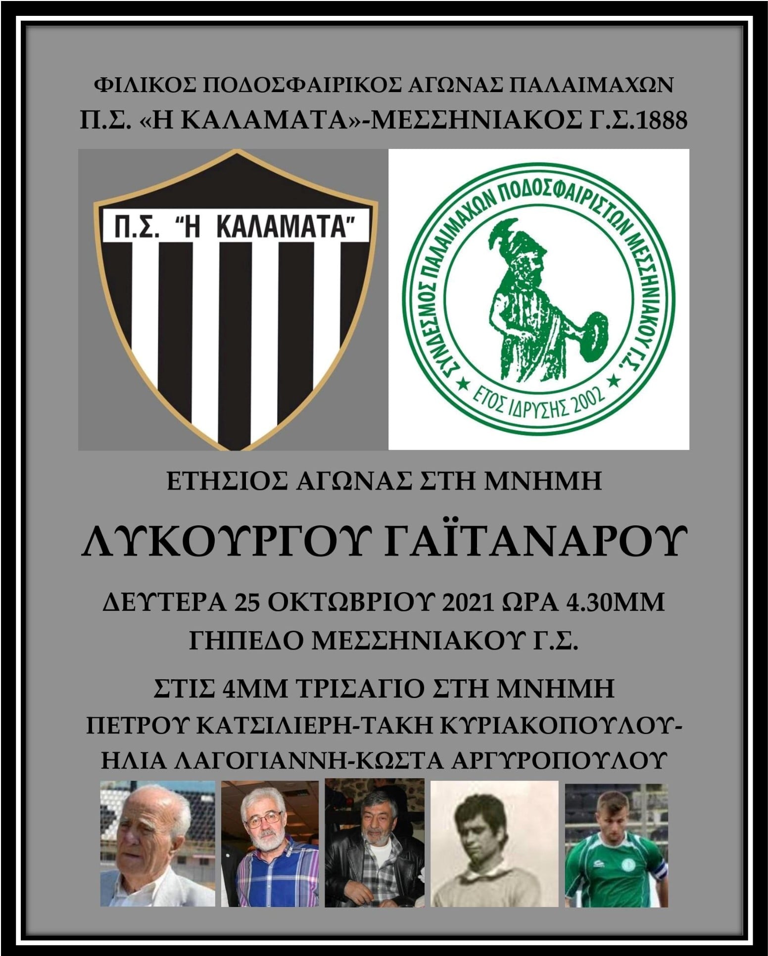 Ο Σύνδεσμος Παλαιμάχων Ποδοσφαιριστών “Π.Σ. Η Καλαμάτα” και ο Σύλλογος Παλαιμάχων του Μεσσηνιακού ΓΣ θα παίξουν φιλικό αγώνα στη μνήμη του αείμνηστου προέδρου της “Μαύρης Θύελλας” Λυκούργου Γαϊτανάρου, τιμώντας παράλληλα τη μνήμη τεσσάρων ακόμη αδικοχαμένων Πέτρου Κατσιλιέρη, Ηλία Λαγογιάννη, Παναγιώτη Κυριακόπουλο και πρόσφατα Κώστα Αργυρόπουλου.