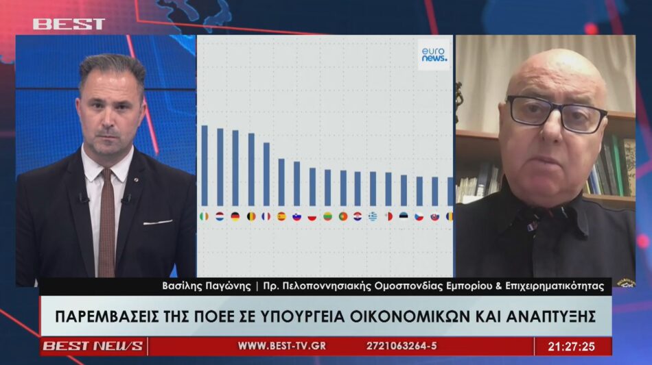 Οι μικρομεσαίες επιχειρήσεις πιέζονται έντονα από φόρους, ενεργειακό κόστος και ενοίκια, ενώ η ακρίβεια μειώνει τη ζήτηση. Παράλληλα, η γεωπολιτική αστάθεια στη Μέση Ανατολή αυξάνει το ενεργειακό κόστος και διαταράσσει τις αγορές, επιβαρύνοντας ακόμη περισσότερο το επιχειρηματικό περιβάλλον. Όλα αυτά περιέγραψε μιλώντας στο κεντρικό δελτίο ειδήσεων του BEST ο Πρόεδρος της ΠΟΕΕ. Ο Βασίλης Παγώνης αναφέρθηκε επίσης στις παρεμβάσεις της Ομοσπονδίας προς τα υπουργεία ανάπτυξης και οικονομικών.