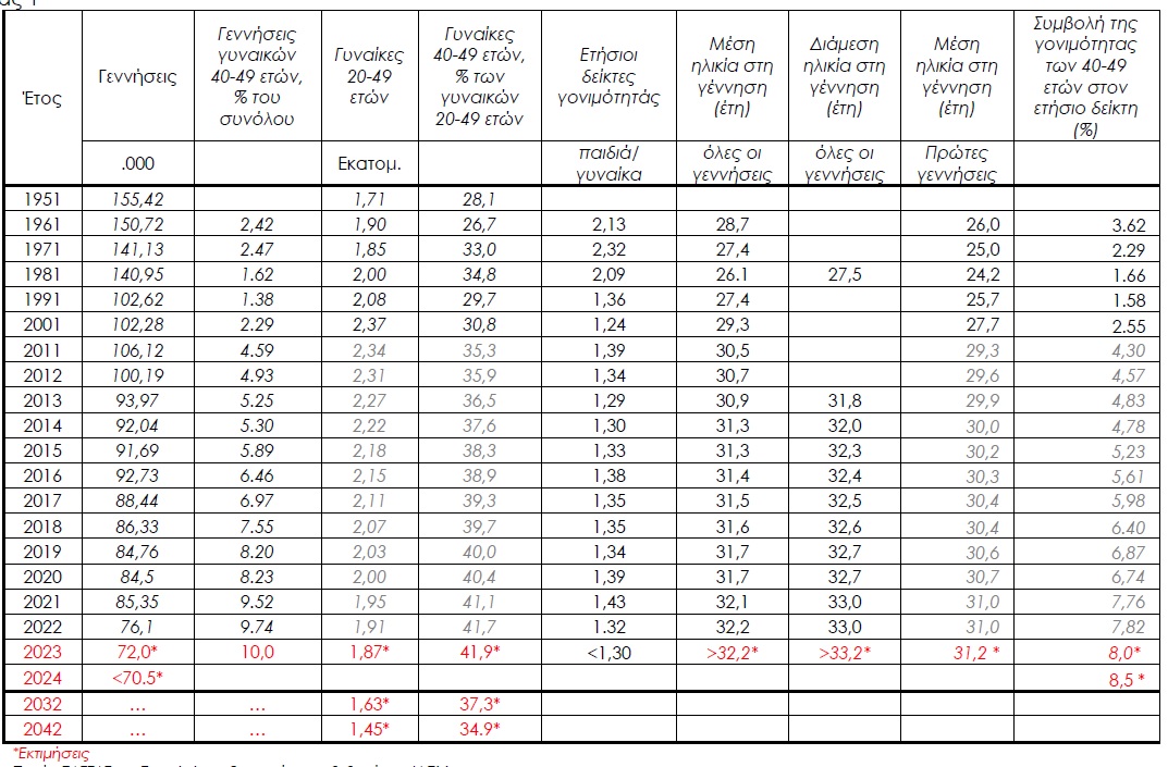 Η ταχύτατη αυξητική τάση των προερχομένων από την τελευταία δεκαετία του αναπαραγωγικού κύκλου των γυναικών γεννήσεων οφείλεται εν μέρει μόνον στην αύξηση του ειδικού βάρους των 40-49 ετών στο εσωτερικό της ομάδας 20-49 ετών την περίοδο αυτή (από 30% το 1991 στο 42% το 2023). Οφείλεται βασικά στο ότι οι γυναίκες που βρίσκονται σε ηλικία απόκτησης παιδιών τις τελευταίες τέσσερεις δεκαετίες κάνουν τα παιδιά τους σε όλο και μεγαλύτερη ηλικία, γεγονός που αποτυπώνεται και στη μέση ηλικία στην τεκνοποίηση τόσο στο σύνολο των γεννήσεων όσο και στην απόκτηση του πρώτου παιδιού( Πίνακας 1). Η ηλικία αυτή μετά από μια πρώτη περίοδο μείωσης ανάμεσα στο 1956 και τις αρχές της δεκαετίας του’80 αυξάνεται ταχύτατα: +7,4 σχεδόν χρόνια στο σύνολο των γεννήσεων ανάμεσα στο 1984 (25,9 έτη) και το 2023 (32,3) και +7 έτη στην απόκτηση του πρώτου παιδιού. Οφείλεται τέλος, εν μέρει, και στις προόδους των τεχνικών υποβοηθουμένης γονιμότητας ως και στην προσφυγή σε αυτές ενός όλου και μεγαλύτερου αριθμού ζευγαριών γεγονός που αποτυπώνεται και στην αύξηση του ειδικού βάρους των πολυδυνάμων τοκετών, το ποσοστό των οποίων τριπλασιάστηκε ανάμεσα στο 1981 και τις αρχές της τρέχουσας δεκαετίας.
