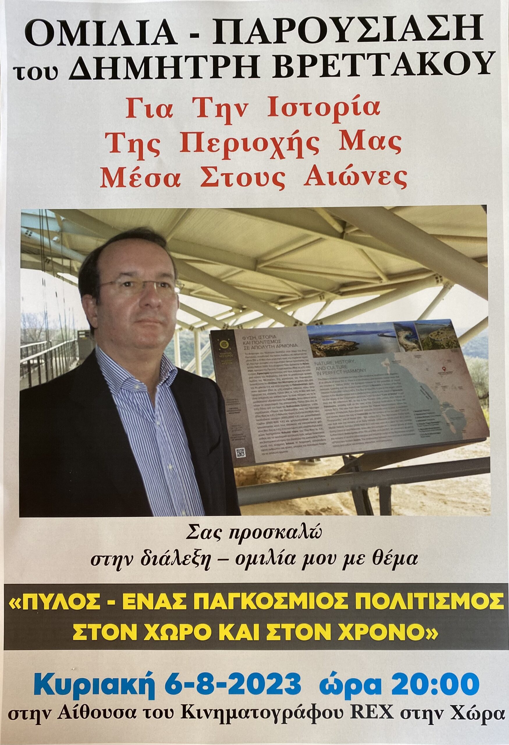 «Πύλος- Ένας παγκόσμιος πολιτισμός στον χώρο και στον χρόνο» είναι το θέμα της ξεχωριστής διάλεξης – ομιλίας του Δημήτρη Βρεττάκου για την ιστορία της περιοχής μέσα στους αιώνες.