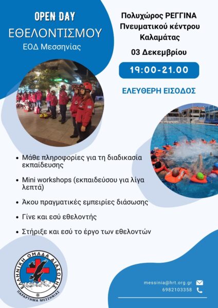 Η Ελληνική Ομάδα Διάσωσης Μεσσηνίας διοργανώνει Open Day Εθελοντισμού, την Τετάρτη 3 Δεκεμβρίου, από τις 19:00 έως τις 21:00, στον Πολυχώρο «Ρεγγίνα» του Πνευματικού Κέντρου Καλαμάτας.