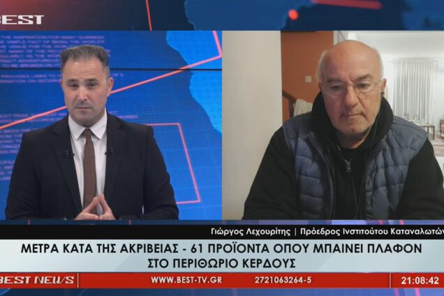 Μέτρα κατά τις ακρίβειας λαμβάνει η κυβέρνηση βάζοντας πλαφόν σε 61 προϊόντα στο περιθωρίου του κέρδους. «Μέτρο κοροϊδίας» το χαρακτήρισε μιλώντας στο Κεντρικό Δελτίο Ειδήσεων της τηλεόρασης BEST ο Πρόεδρος του Ινστιτούτου Καταναλωτών Γιώργος Λεχουρίτης συμπληρώνοντας «Όταν βάζεις πλαφόν χωρίς