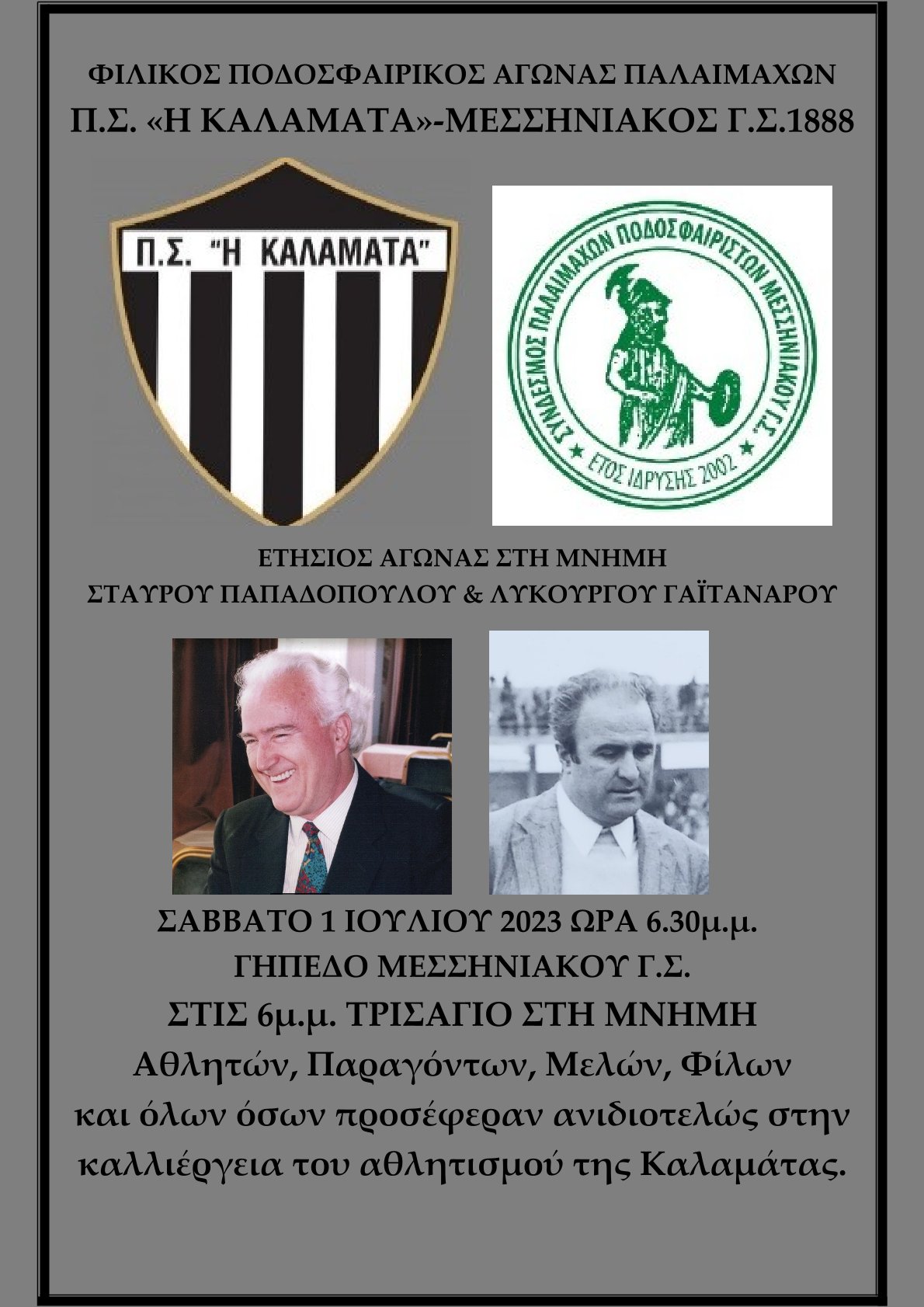 Το Σάββατο 1η Ιουλίου 2023 και ώρα 18.30 στο γήπεδο του Μεσσηνιακού, θα διεξαχθεί ο ετήσιος φιλικός ποδοσφαιρικός αγώνας μεταξύ των ομάδων Παλαιμάχων των Συνδέσμων Παλαίμαχων ποδοσφαιριστών Π.Σ. «Η Καλαμάτα» και Μεσσηνιακού Γ.Σ. 1888, στη μνήμη των Σταύρου Παπαδόπουλου και Λυκούργου Γαϊτανάρου, και όλων των Αθλητών, Παραγόντων, Μελών, Φίλων, όσων δηλαδή προσέφεραν ανιδιοτελώς στην καλλιέργεια του αθλητισμού της Καλαμάτας.