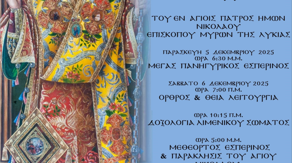 Σάββατο 6 Δεκεμβρίου, 5:00 μ.μ.: Μέγας Πανηγυρικός Μεθέορτος Εσπερινός και Παράκληση του Αγίου Νικολάου.