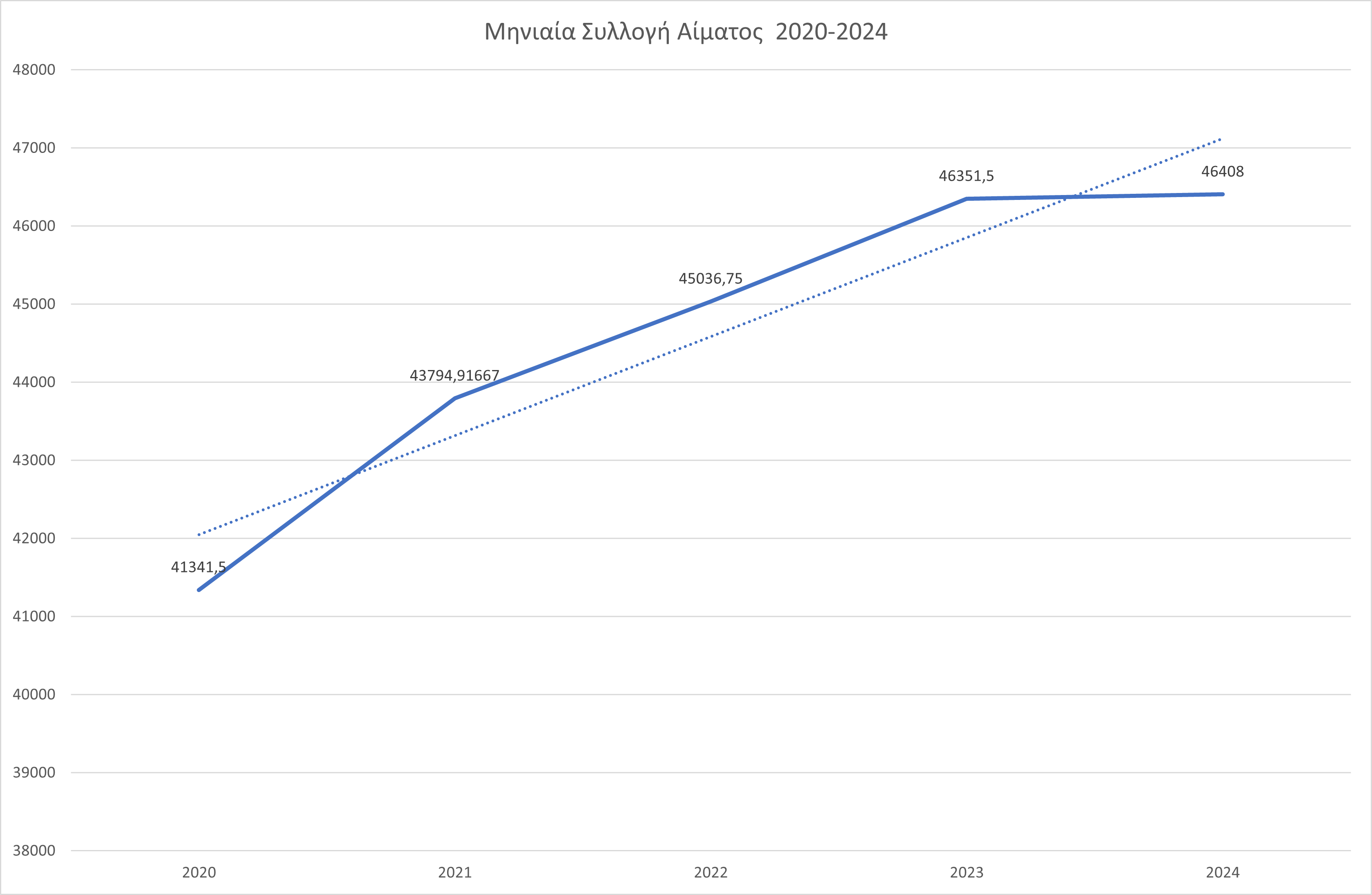 - Όσον αφορά την συλλογή αίματος καταφέραμε κάθε χρόνο να συγκεντρώνουμε όλο και περισσότερες μονάδες αίματος οι οποίες αποδίδονται στον επισυναπτόμενο πίνακα. Εκκινώντας το 2020 όπου συλλέχθηκαν 41341 μονάδες αίματος, φθάσαμε το 2024 και τις 46408 μονάδες αίματος αποδεικνύοντας ότι με διαρκή προσπάθεια, μπορούμε αργά αλλά σταθερά να πετύχουμε καλύτερα αποτελέσματα προς όφελος των πολιτών. Για το έτος 2025 η συλλογή αίματος βαίνει με αυξητικούς ρυθμούς και για τον μήνα Μάρτιο έως τώρα έχουν συλλεγεί 34938 μονάδες αίματος, δηλαδή 3168 περισσότερες από πέρυσι.
