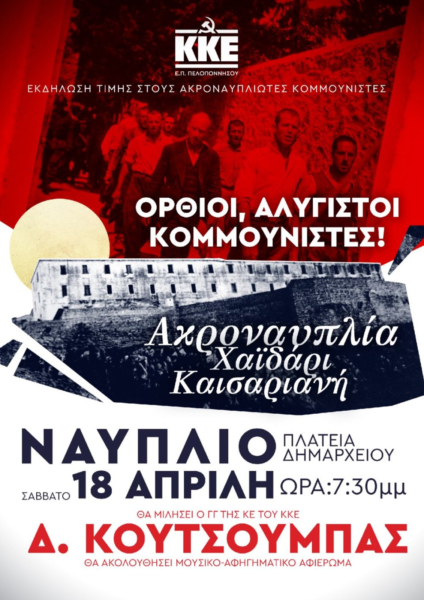 Μεγάλη εκδήλωση με ομιλία του ΓΓ της ΚΕ του ΚΚΕ Δημήτρη Κουτσούμπα θα πραγματοποιήσει η Οργάνωση Περιοχής Πελοποννήσου το Σάββατο 18 Απρίλη στο Ναύπλιο, στις 7.30 μ.μ. στην πλατεία Δημαρχείου, τιμώντας τους χιλιάδες κομμουνιστές που ήταν φυλακισμένοι στην Ακροναυπλία και ορισμένοι εκτελέστηκαν στο Σκοπευτήριο της Καισαριανής την 1η Μάη 1944 από τους Γερμανούς – ναζί κατακτητές.