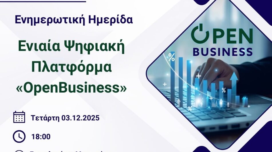 Το Επιμελητήριο Μεσσηνίας και η Ομοσπονδία Επαγγελματικών, Βιοτεχνικών και Εμπορικών Σωματείων Ν. Μεσσηνίας (Ο.Ε.Β.Ε.Σ), διοργανώνουν ενημερωτική ημερίδα παρουσίασης της Ενιαίας Ψηφιακής Πλατφόρμας OpenBusiness, η οποία θα πραγματοποιηθεί την Τετάρτη 3 Δεκεμβρίου 2025 και ώρα 18:00, στην αίθουσα συνεδριάσεων του Επιμελητηρίου Μεσσηνίας – Πλατεία 23ης Μαρτίου.