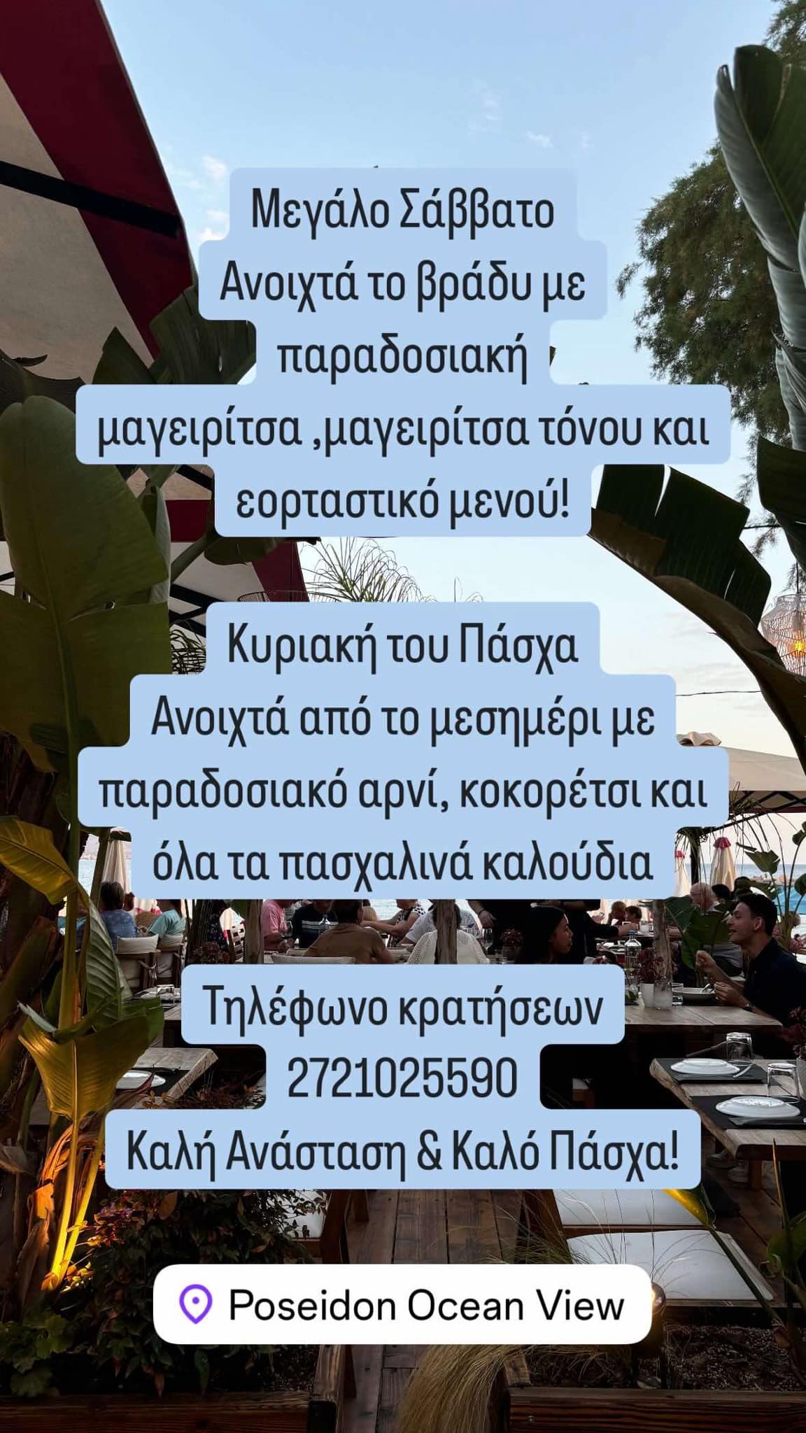 Το Poseidon Ocean View σας περιμένει σήμερα, Μεγάλο Σάββατο για την παραδοσιακή μαγειρίτσα, για μαγειρίτσα τόνου και πολλές ακόμη προτάσεις σε ένα προσεγμένο μενού, ανάλογο των ημερών.