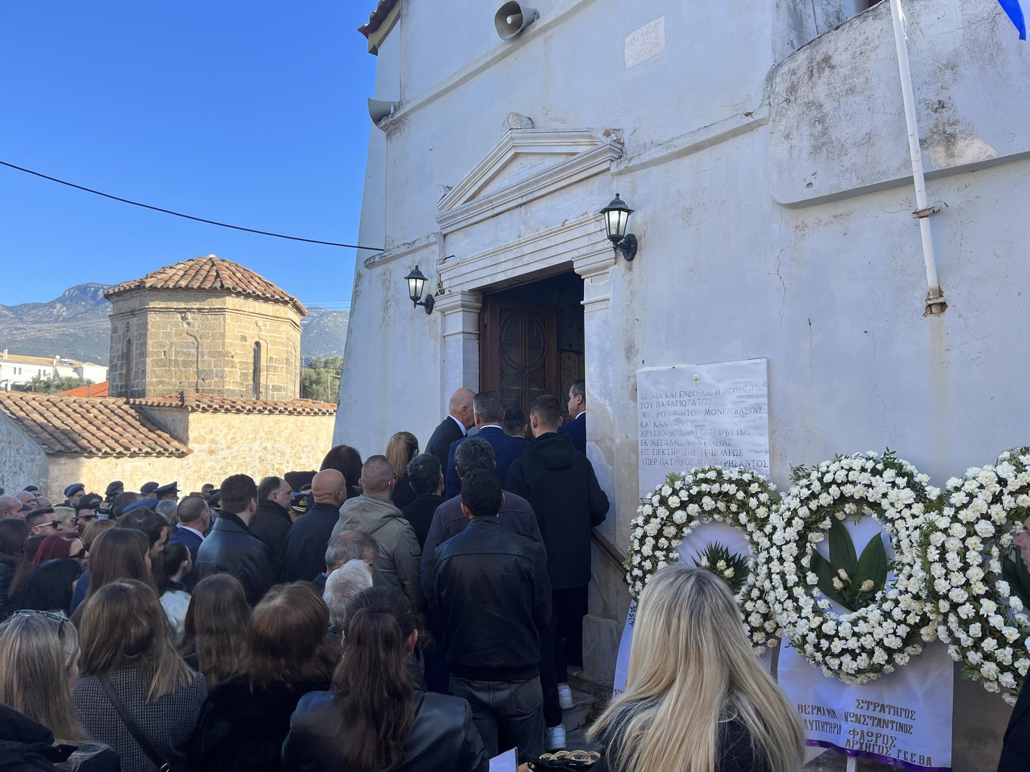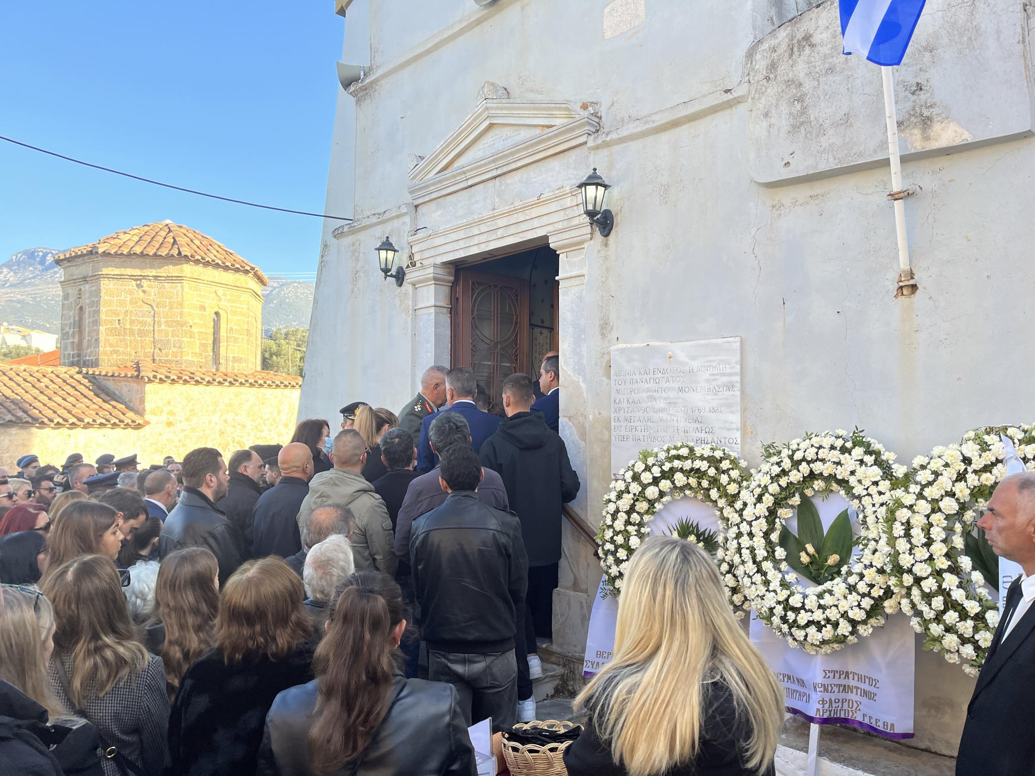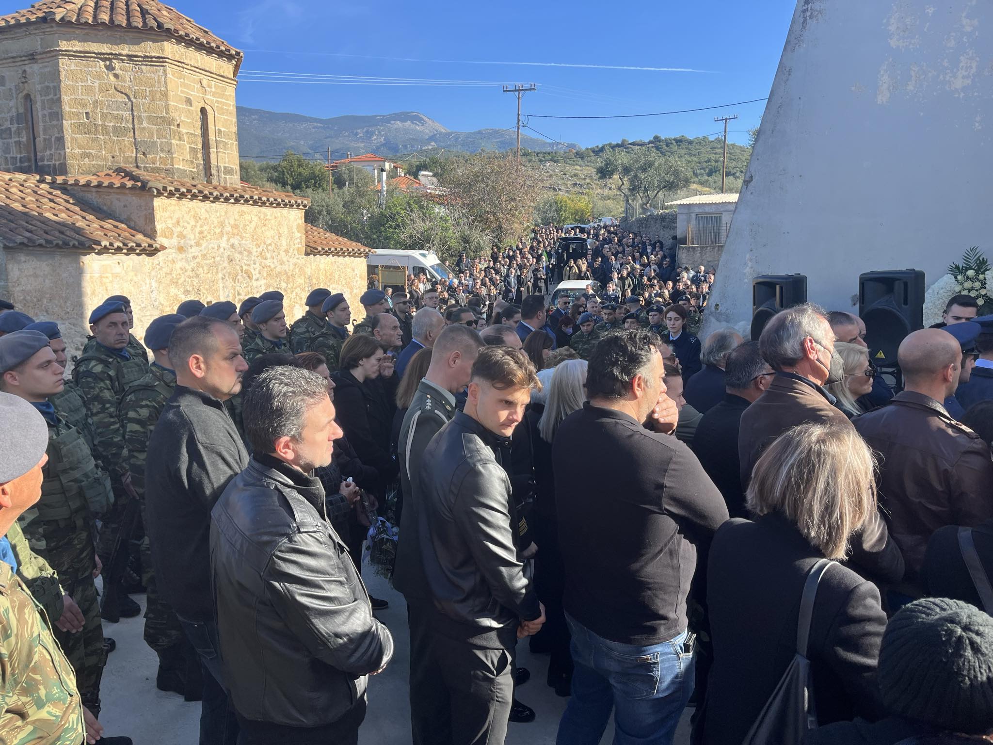 Πλήθος απλού κόσμου έσπευσε στην εκκλησία για να τιμήσει τον επισμηναγό που έπεσε εν ώρα καθήκοντος. Λόγια παρηγοριάς είναι αδύνατον να ειπωθούν αυτές τις στιγμές, στους δικούς του ανθρώπους.