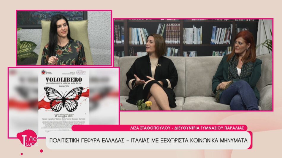 Η εκπομπή «Τι Λες Τώρα» με την Αναστασία Μάντζαρη φιλοξένησε την κα Μαργαρίτα Πολυδούρη, Πρόεδρο του Συλλόγου Γυναικών Μικρομάνης «Μαρία Πολυδούρη», και την κα Λίζα Σταθοπούλου, Διευθύντρια του Γυμνασίου Παραλίας. Η συζήτηση ανέδειξε την πρόσφατη αδελφοποίηση του ελληνικού συλλόγου με τον ιταλικό Agape και τη δυναμική κοινή δράση «VOLOLIBERO» που διοργανώθηκε στις 25 Νοεμβρίου για την εξάλειψη της βίας κατά των γυναικών. Η κα Πολυδούρη αναφέρθηκε στην πολιτιστική γέφυρα που χτίζεται, ενώ η κα Σταθοπούλου εξήγησε τον σημαντικό ρόλο των μαθητών του Γυμνασίου Παραλίας, των οποίων τα έργα τέχνης εκτέθηκαν ταυτόχρονα στην Galleria Dorico της Ανκόνα, στέλνοντας ένα δυνατό μήνυμα κατά της βίας μέσω της δημιουργίας.