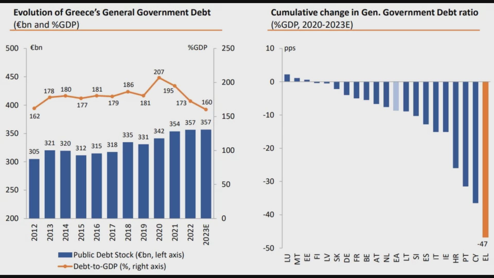 Αναμφίβολα ξεχωρίζει η εντυπωσιακή μείωση του λόγου του χρέους προς το ΑΕΠ κατά σχεδόν 50 ποσοστιαίες μονάδες μεταξύ 2020 και 2023, χάρη στις ισχυρές μακροοικονομικές επιδόσεις και αυτά τα εξαιρετικά χαρακτηριστικά του χρέους.