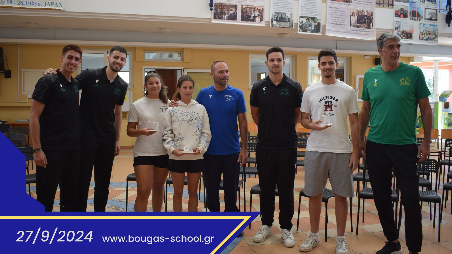 Σημαντική στιγμή της ημέρας ήταν η βράβευση από τον κ. Χατζηαντωνίου μαθητών/τριών των Εκπαιδευτηρίων Μπουγά, Αραπάκη Μηνά (βασικός πασαδόρος στην εθνική βόλεϊ U19, με συμμετοχή σε 2 Ευρωπαϊκά Πρωταθλήματα), Κάρτσωνα Κωνσταντίνας (Πανελληνιονίκης στη σφυροβολία Κ16- μέλος της Εθνικής ομάδας) και Μαργαρίτη Δανάης (1η, 2η, 3η θέση σε μονό και διπλό στο τένις, σε Ευρωπαϊκό μίτινγκ U14) που διακρίθηκαν σε Πανελλήνιο και Διεθνές επίπεδο.