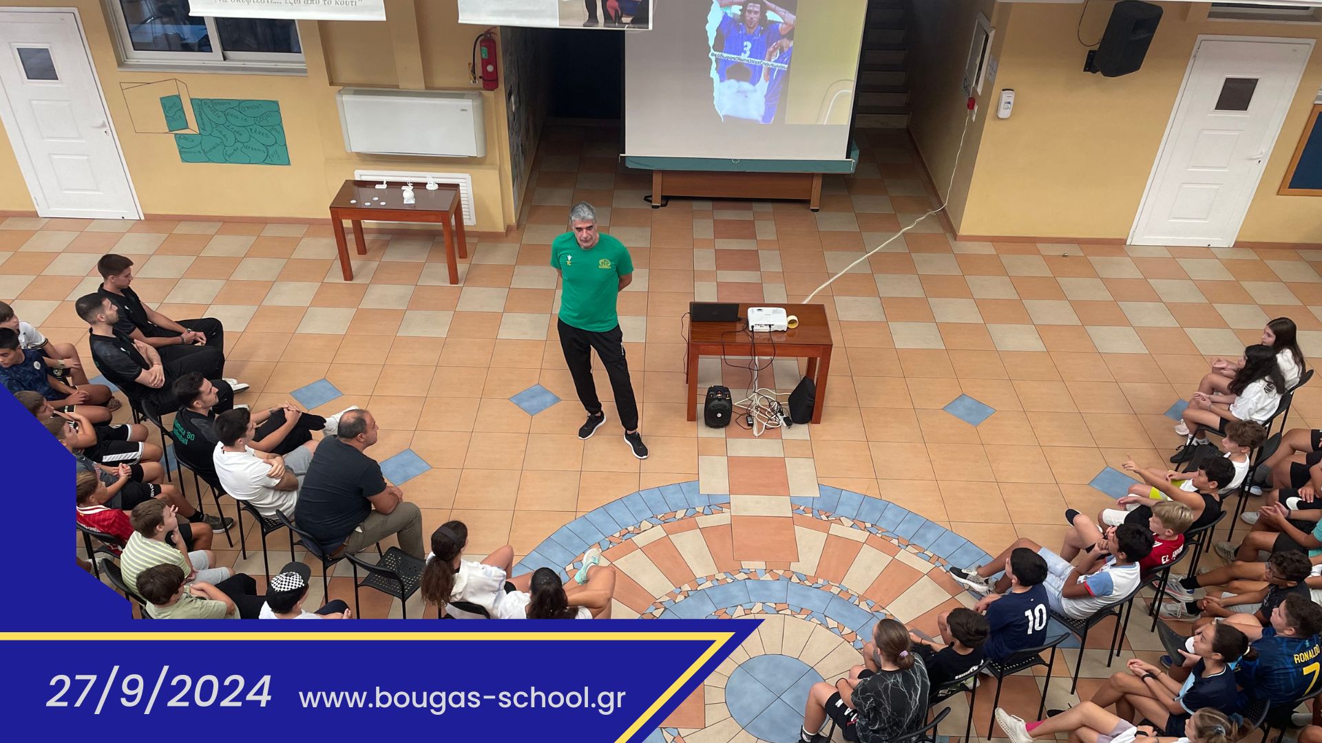 Παράλληλα, το σχολείο μας είχε τη χαρά και την τιμή να φιλοξενήσει τον πρώην διεθνή παίχτη του βόλεϊ και τώρα προπονητή, Θεόδωρο (Άκη) Χατζηαντωνίου, ο οποίος κατέκτησε με την Εθνική μας ομάδα την 5η θέση στους Ολυμπιακούς Αγώνες της Αθήνας και κατέχει το ρεκόρ των 401 συμμετοχών με τα χρώματα της Ελλάδας. Ο κ. Χατζηαντωνίου ενέπνευσε τους μαθητές με την ομιλία του και τους μύησε στο ολυμπιακό ιδεώδες, παίζοντας μαζί τους.