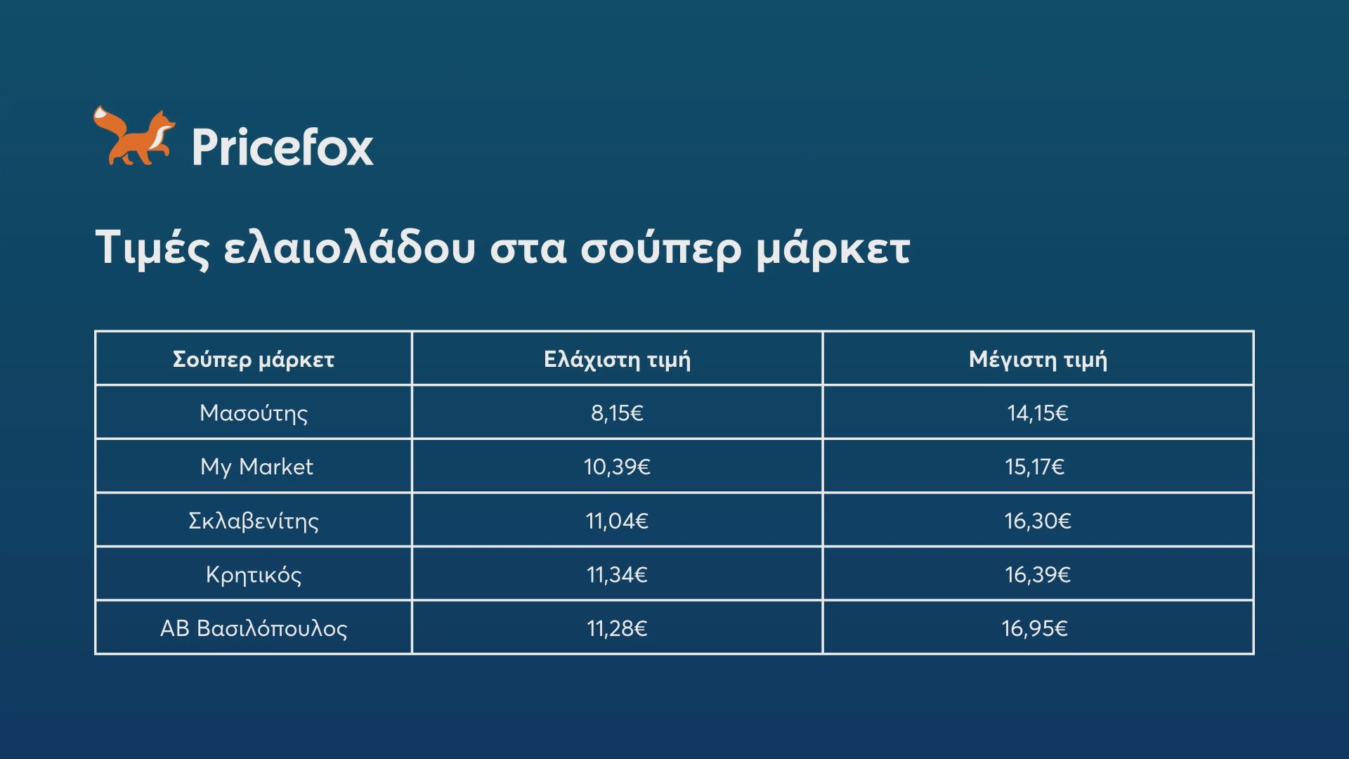 Με πραγματικές τιμές από το παρατηρητήριο αγοράς, το Pricefox συγκέντρωσε τις τιμές του ελαιολάδου στις 5 μεγαλύτερες αλυσίδες σούπερ μάρκετ.
