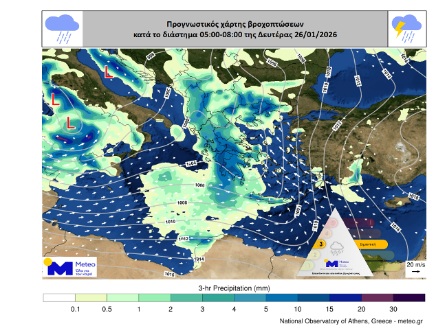 Ειδικότερα και σύμφωνα με τα διαθέσιμα προγνωστικά στοιχεία του Εθνικού Αστεροσκοπείου Αθηνών / Meteo.gr, τη Δευτέρα 26/01 αναμένονται ισχυρές βροχές και καταιγίδες στα δυτικά, σταδιακά στην Ανατολική Στερεά, στη Νότια και Ανατολική Πελοπόννησο, στην Εύβοια, στην Κεντρική και Ανατολική Στερεά, από τις προμεσημβρινές ώρες στην Κρήτη, στις Κυκλάδες από το μεσημέρι στις Σποράδες, στα νησιά του Βόρειου και Ανατολικού Αιγαίου και στα Δωδεκάνησα.
