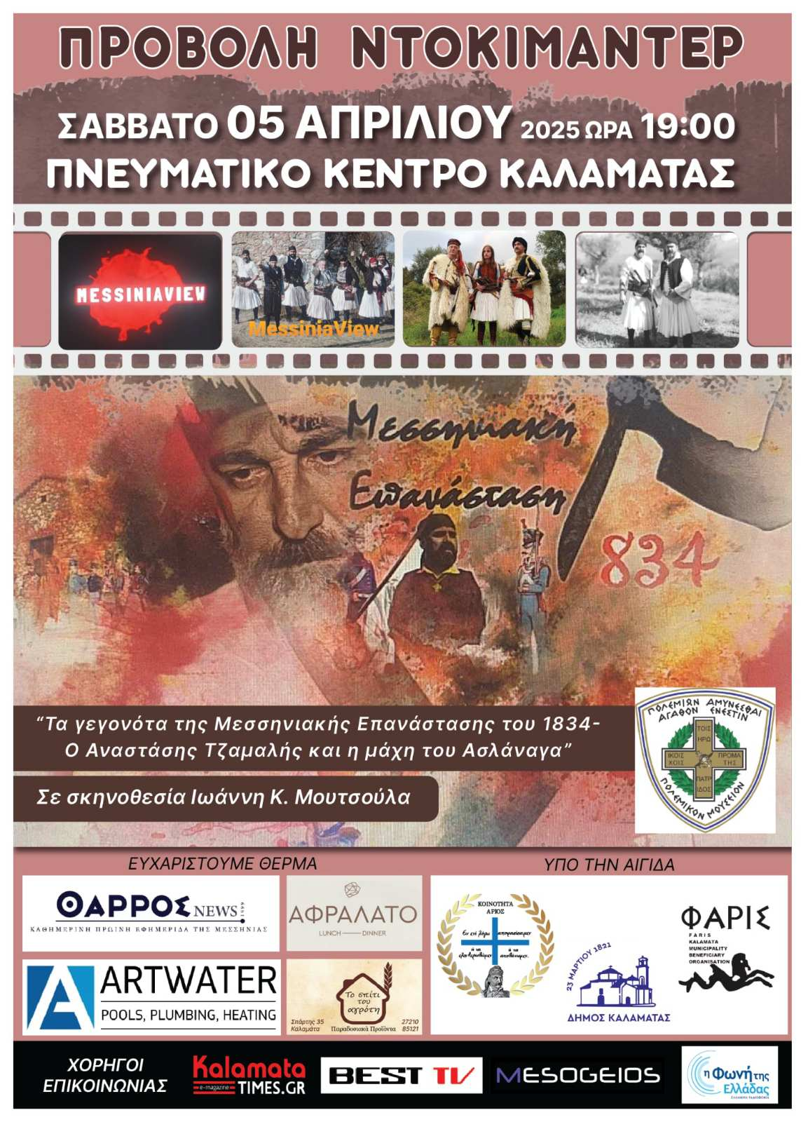 Στο Πνευματικό κέντρο της Καλαμάτας πρόκειται να προβληθεί σήμερα, Σάββατο 5-4-2025, στις 19:00 το ιστορικό ντοκιμαντέρ για τα γεγονότα της Μεσσηνιακης επανάστασης του 1834.