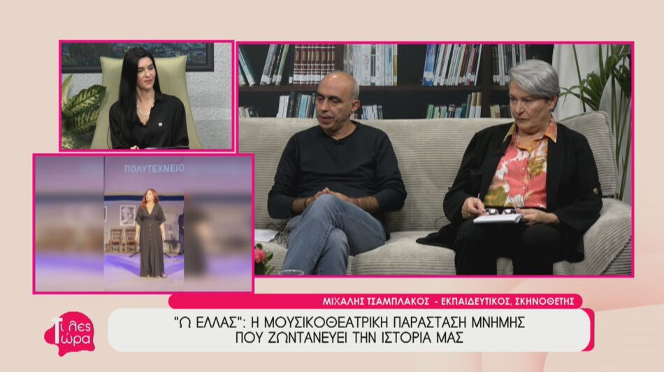 Ο σκηνοθέτης και εκπαιδευτικός, Μιχάλης Τσαμπλάκος, και η Βίκυ Καραφώτη, υπεύθυνη Δημοσίων Σχέσεων του Συλλόγου Ποντίων Μεσσηνίας “Η ΝΕΑ ΡΩΜΑΝΙΑ”, καλεσμένοι στην εκπομπή ”Τι Λες Τώρα” με την Αναστασία Μάντζαρη, μίλησαν για την μουσικοθεατρική παράσταση μνήμης “Ω ΕΛΛΑΣ”, η οποία θα πραγματοποιηθεί το , που φέρνει στο προσκήνιο τη νεότερη και σύγχρονη ελληνική ιστορία.