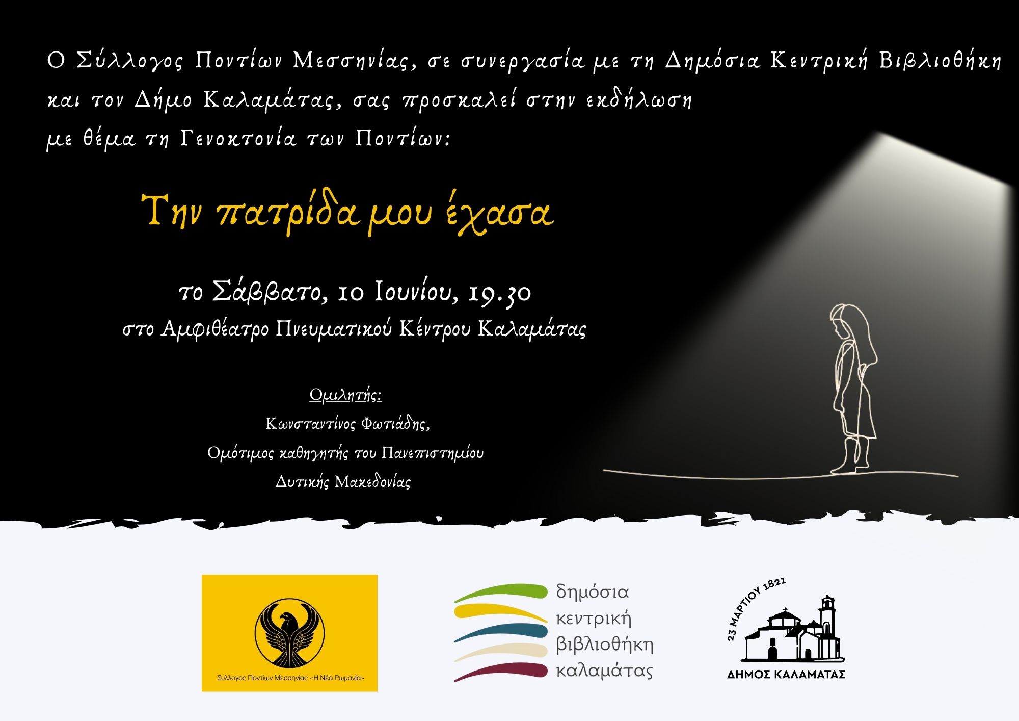 Ο Σύλλογος Ποντίων Μεσσηνίας “Η Νέα Ρωμανία” σε συνεργασία με τη Δημόσια Κεντρική Βιβλιοθήκη Καλαμάτας και τον Δήμο Καλαμάτας διοργανώνει εκδήλωση με τίτλο “Την Πατρίδα μου έχασα” το Σάββατο, 10 Ιουνίου, στο Αμφιθέατρο του Πνευματικού Κέντρου Καλαμάτας. Στην εκδήλωση θα μιλήσει ο Ομότιμος καθηγητής του Πανεπιστημίου Δυτικής Μακεδονίας κος Κωνσταντίνος Φωτιάδης, με θέμα «Η Γενοκτονία των Ελλήνων του Πόντου »