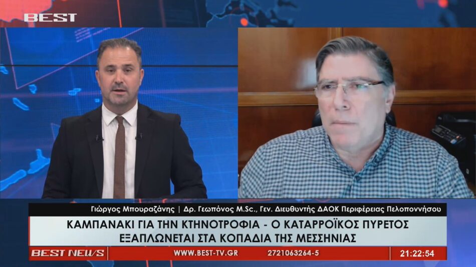 Ραγδαία είναι η εξάπλωση του καταρροϊκού πυρετού και σε κτηνοτροφικές μονάδες της Μεσσηνίας, όπως κρούσματα εμφανίστηκαν και στην Αρκαδία, με την ανησυχία να «φουντώνει» και τους ελέγχους να εντείνονται. Μια σημαντική παρέμβαση υπήρξε στο Κεντρικό Δελτίο Ειδήσεων της τηλεόρασης BEST από τον Δρ. Γεωπόνο M.S.c και Γενικό Διευθυντή ΔΑΟΚ της Περιφέρειας Πελοποννήσου Γιώργο Μπουραζάνη.