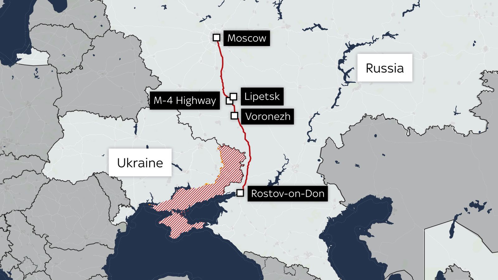 Στον παρακάτω χάρτη που δημοσιεύει το Sky News φαίνεται η πορεία που θα ακολουθούσε η Wanger από το Ροστόφ ως τη Μόσχα. Εν τέλει η πορεία διακόπηκε περίπου 200 χιλιόμετρα έξω από τη Μόσχα.
