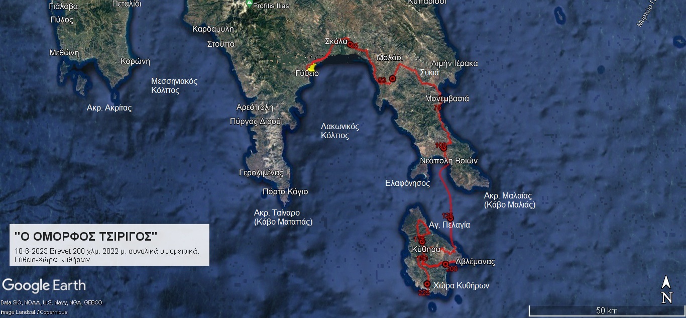 Στο 1ο Brevet Κυθήρων των 200 χλμ. έλαβαν μέρος έξι Καλαματιανοί μεταξύ των οποίων και ο Γεώργιος Κλείδωνας του τμήματος αγωνιστικής ποδηλασίας του Σ.Π.Ο.Κ. ”Ο Ευκλής”.