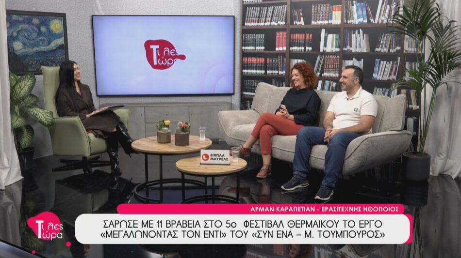 Η Μιμίκα Τάσση, ερασιτέχνης ηθοποιός και νικήτρια του Βραβείου Α’ Γυναικείου Ρόλου και ο Αρμάν Καραπετιάν, ερασιτέχνης ηθοποιός και νικητής του Βραβείου Α’ Ανδρικού Ρόλου, βρέθηκαν καλεσμένοι στην εκπομπή «Τι Λες Τώρα» με τηνΑναστασία Μάντζαρη . Οι δύο ηθοποιοί του Θεατρικού Σχήματος «ΣΥΝ ΕΝΑ –Μιχάλης Τούμπουρος» μίλησαν για τη μεγάλη καλλιτεχνική επιτυχία της παράστασης «Μεγαλώνοντας τον Έντι» (σκηνοθεσία Πάνου Ηλιόπουλου), η οποία σάρωσε στο 5ο Πανελλήνιο Φεστιβάλ Ερασιτεχνικού Θεάτρου Θερμαϊκού, κατακτώντας το εντυπωσιακό ρεκόρ των 11 βραβείων. Μεταξύ άλλων, η συζήτηση