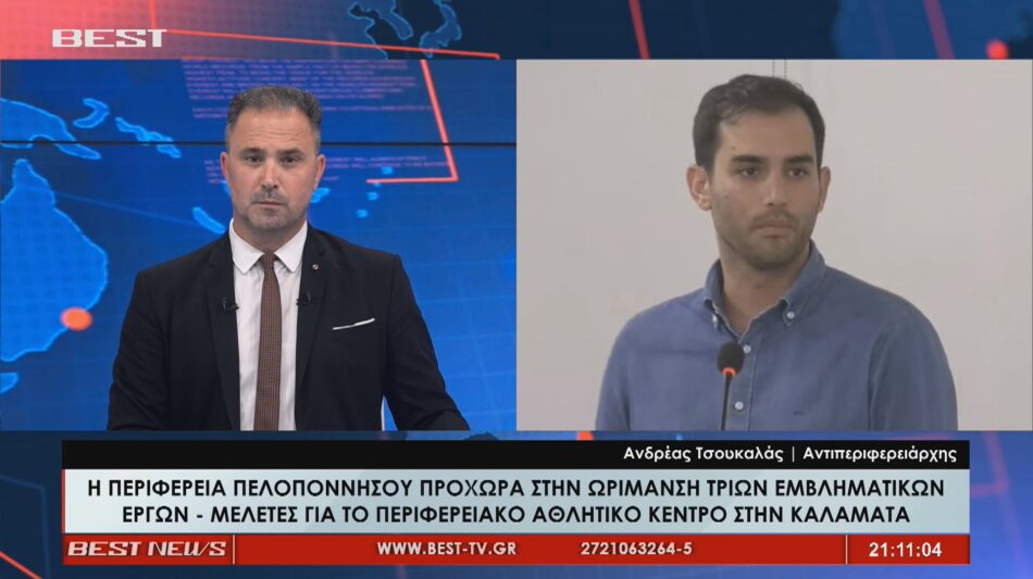 Η Περιφέρεια Πελοποννήσου προχωρά στην ωρίμανση τριών εμβληματικών έργων με μελέτες, όπως για το περιφερειακό αθλητικό κέντρο στην Καλαμάτα με τον Αντιπεριφερειάρχη Ανδρέα Τσουκαλά να σημειώνει μιλώντας στο Κεντρικό Δελτίο Ειδήσεων της τηλεόρασης BEST «Είναι τρία σημαντικά έργα για την Περιφέρεια Πελοποννήσου» ενώ όσον αφορά την αναβάθμιση των εγκαταστάσεων της Κεντρικής Αγοράς Καλαμάτας επεσήμανε «Η αγορά της Καλαμάτας έχει Πελοποννησιακό χαρακτήρα είναι ένα κομβικό σημείο και δεν μπορούσε η Περιφέρεια να συνεργαστεί με το δήμο για την αναβάθμιση του. Δώδεκα μήνες θα διαρκέσει η μελέτη που θα περιλαμβάνει σύγχρονες εγκαταστάσεις αλλάζοντας ριζικά την εικόνα της».
